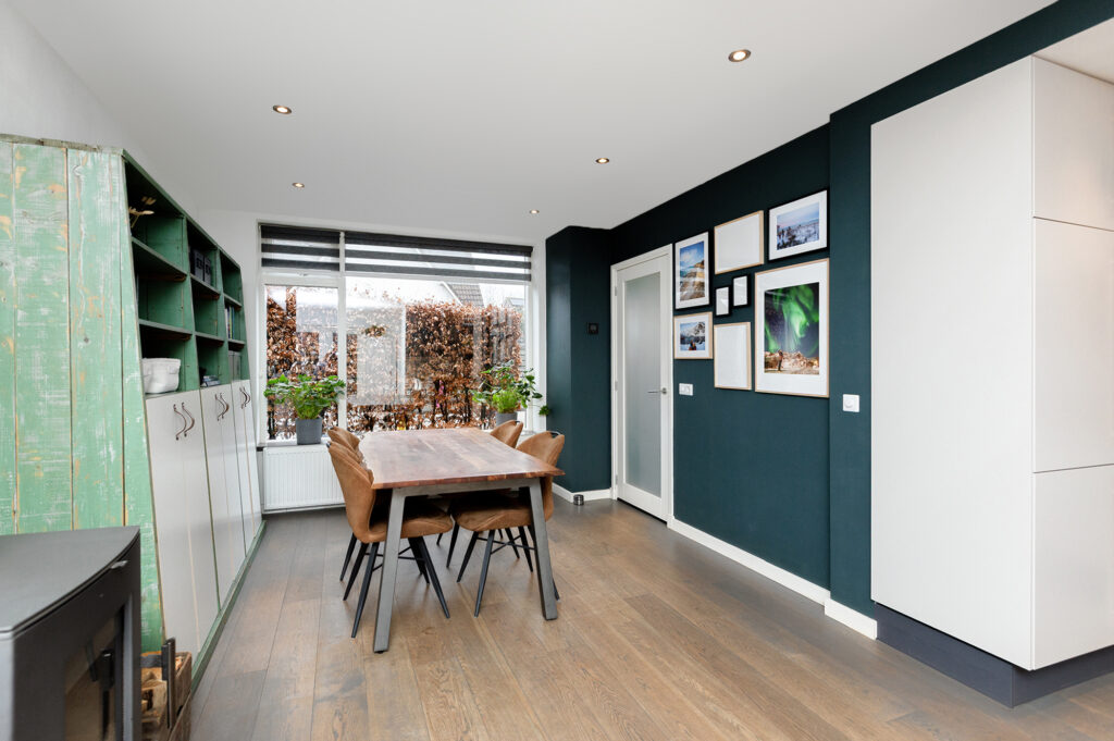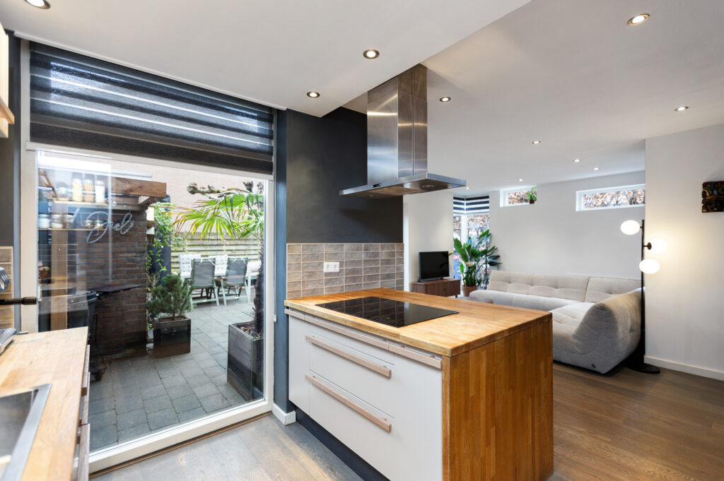 Nette bestrate voortuin met beukenhaag en groene border leidend naar de voordeur. Je komt binnen in een hal met voldoende garderobemogelijkheid en toegang tot de 1e verdieping, meterkast, woonkamer, trapkast en de toiletruimte. De toiletruimte is lang met daardoor veel beenruimte. Verder beschikt de ruimte over een nette zwarte tegelvloer doorgetrokken tot achter het toilet, een hangtoilet, radiator, mechanische ventilatie, witte wandtegels en een fonteintje. Via een deur kom je vanuit de hal in de sfeervolle ruime woonkamer van circa 46m2 met moderne hout gestookte haard. Op de vloer ligt een mooie doorgetrokken eikenhouten vloer in de kleur vergrijsd eiken en alle wanden en plafond zijn glad gestuukt. De woonkamer is heerlijk ruim dankzij de uitbouw en licht dankzij de grote raampartijen aan weerszijden en aan de zijkant van de woning. Een grote zithoek met zicht op de tuin is gecreëerd aan de achterzijde van de woning en aan de voorzijde is voldoende ruimte voor het plaatsen van een lange eettafel. De open keuken ligt centraal waardoor je goed overzicht hebt op de gehele woonruimte en achtertuin. De keukenwand heeft een L-vorm en is voorzien van een mooi eikenhouten blad, taupe kleurige wandtegels en nieuwe (2025) zand kleurige frontjes met bijpassende eikenhout grepen. Dankzij de vele keukenkastjes is er veel opbergruimte. Verder tref je hier een vaatwasser (2024), een oven, een combi oven magnetron, een koel-vriescombinatie en een grote spoelbak met mengkraan. Een 4 pits inductie kookplaat (2025) met afzuigkap bevindt zich in het kookeiland, eveneens voorzien van een eiken houten blad en zandkleurige keukenkastjes. Het kookeiland biedt ook plek voor twee krukken aan de bar.