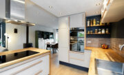 – Strakke moderne open keuken met kookeiland en bar