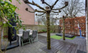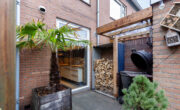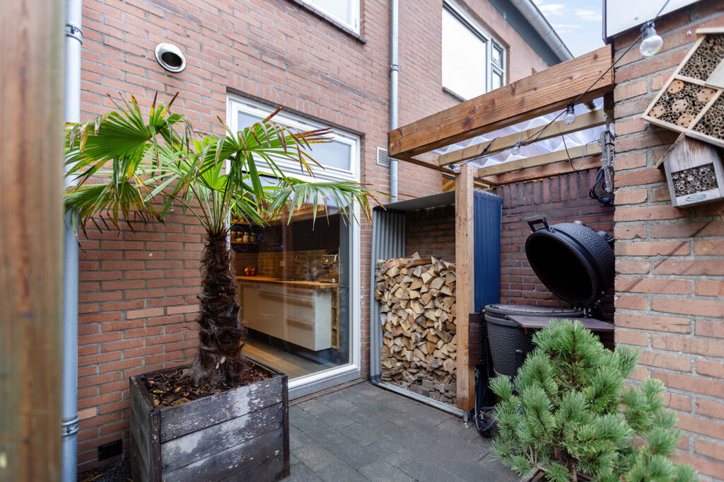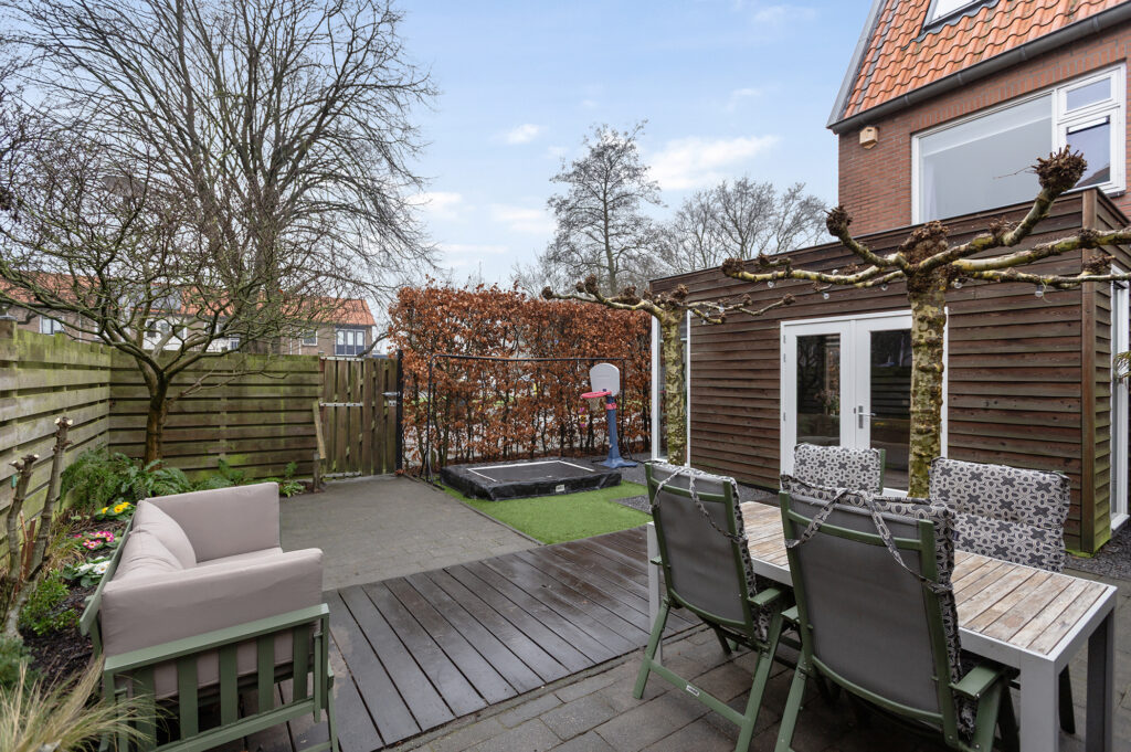 Via openslaande tuindeuren bereik je de zonnige achtertuin. Dankzij de ligging zit je hier heerlijk privé zonder inkijk. De tuin is kindvriendelijk, onderhoudsvrij maar beschikt ook over groen. Twee mooie platanen bieden schaduw in de zomer. Een vlonder pad, met aan weerszijden terrastegels, brengt je naar een lange verhoogde border met groen achterin de tuin. Het kunstgrasveldje met trampoline is ideaal voor opgroeiende kinderen. De tuin beschikt over een achterom maar via de zij tuin kan ook de voortuin worden bereikt. In de achtertuin staat ook een grote stenen vrijstaande berging met aangrenzend een kleine overkapping, ideaal voor de BBQ en houtopslag.