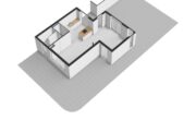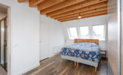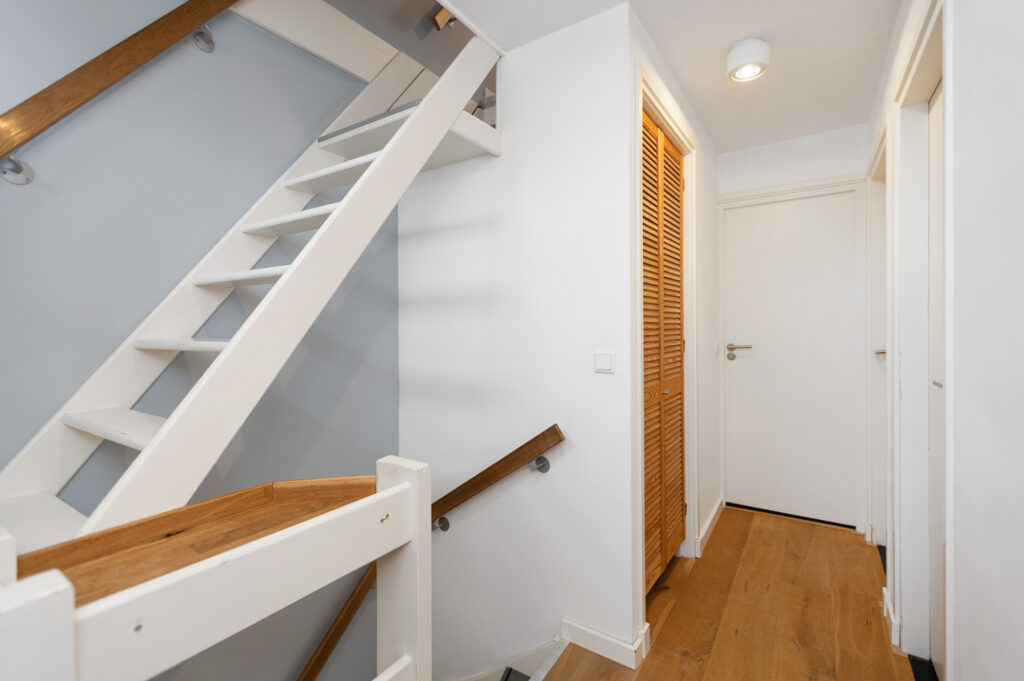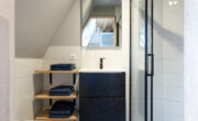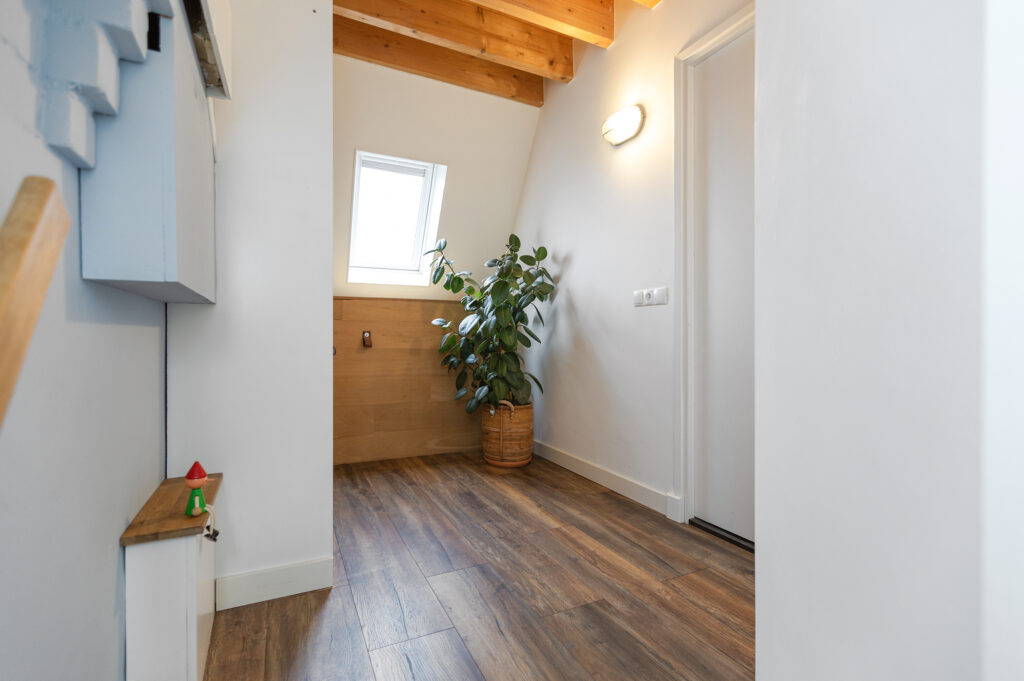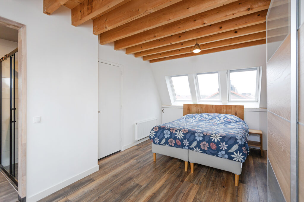 Vaste trap met klein bordes halverwege. Dankzij een zijraam krijgt de overloop, met trap naar boven, voldoende daglicht. Voorzolder met toegang tot royale ouderslaapkamer en badkamer ensuite. Het eerst wat op de verdieping opvalt is het mooie hoge balkenplafond wat afsteekt tegen de strak gestuukte witte wanden en plafond. Op de vloer ligt een nette doorgetrokken laminaatvloer in de kleur eiken. De voorzolder beschikt over een kunststof Velux tuimelraam en netjes afgetimmerde opbergruimte onder de knieschotten. Hier tref je ook de opstelplaats voor de CV (2024). De ouderslaapkamer is heerlijk licht dankzij 3 grote Velux tuimelramen (kunststof) aan weerszijden met zonwering aan de achterzijde. De badkamer ensuite is modern met een antraciet kleur tegelvloer i.c.m. witte wandtegels. Verder tref je hier een ruime inloopdouche met hand- en stort douche, een hangtoilet, een spiegel met verwarming en een wastafel met meubel.