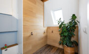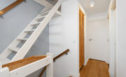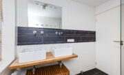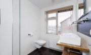 Nette doorgetrokken eikenhouten vloer en glad gestuukte wanden en plafond. De overloop biedt toegang tot 2 ruime slaapkamers, een diepe kast met wasmachine/droger aansluiting en een badkamer. De badkamer is modern en in lijn met de toiletruimte beneden met nette witte wandtegels i.c.m. strakke zwarte vloertegels doorgetrokken tot achter de ruime inloopdouche. Deze beschikt over een praktisch nisje, een glaswand, een hand- en stort douche en een drain. Verder tref je hier een hangtoilet, mechanische ventilatie, een raam, een radiator en een wastafelmeubel met 2 leuke vierkante waskommen en mengkraan.