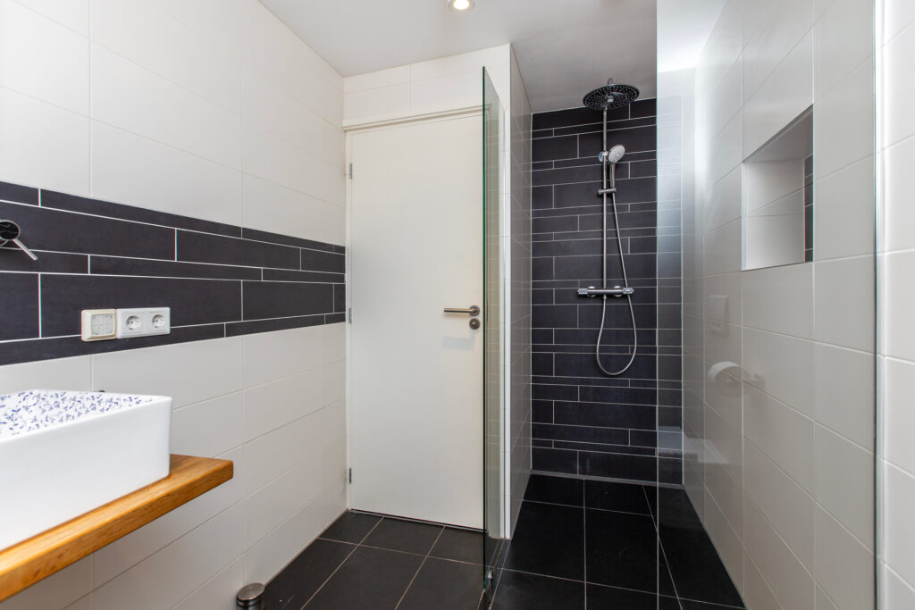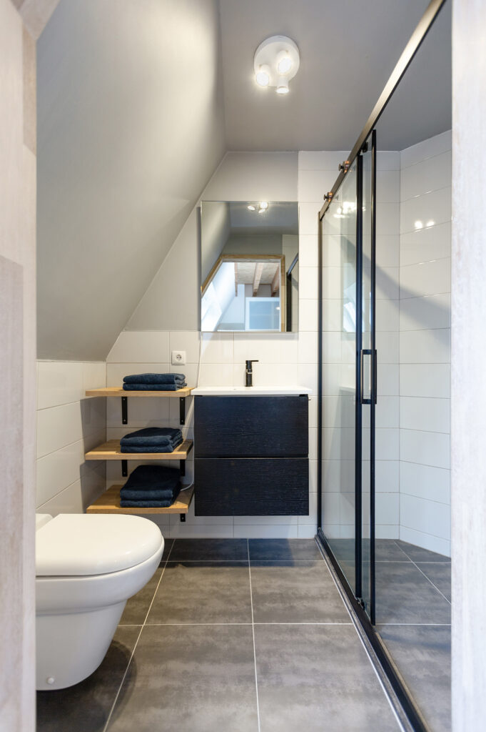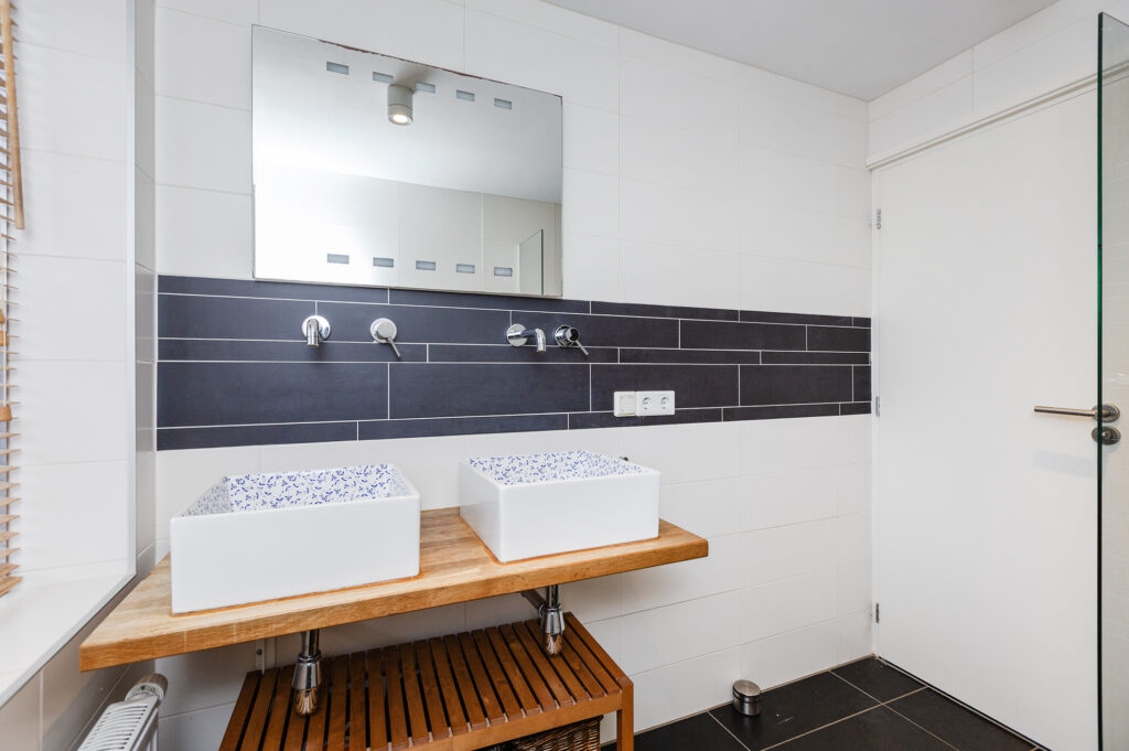 – Moderne badkamer met ruime inloopdouche, dubbele wastafel en hangtoilet op de 1e verdieping