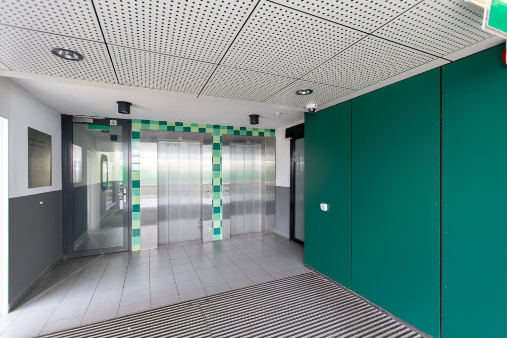 Moderne overdekte nette entree met bellenbord en postbussen. Toegang tot 2 liften en tot een trapopgang.