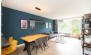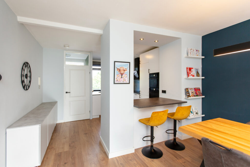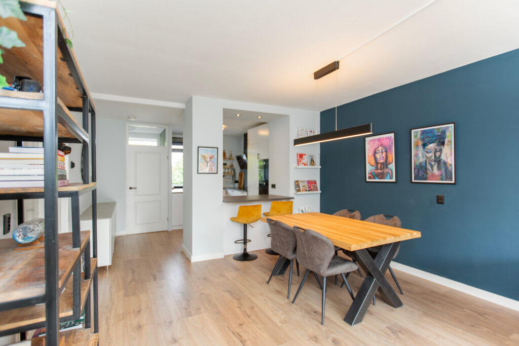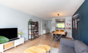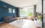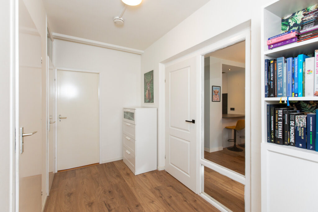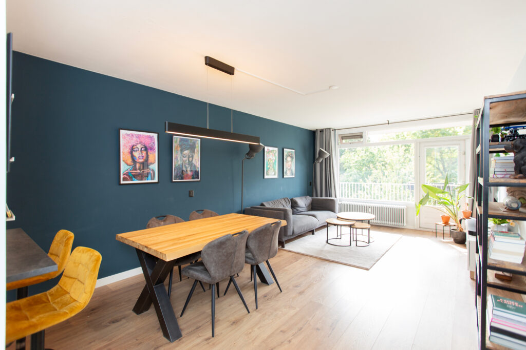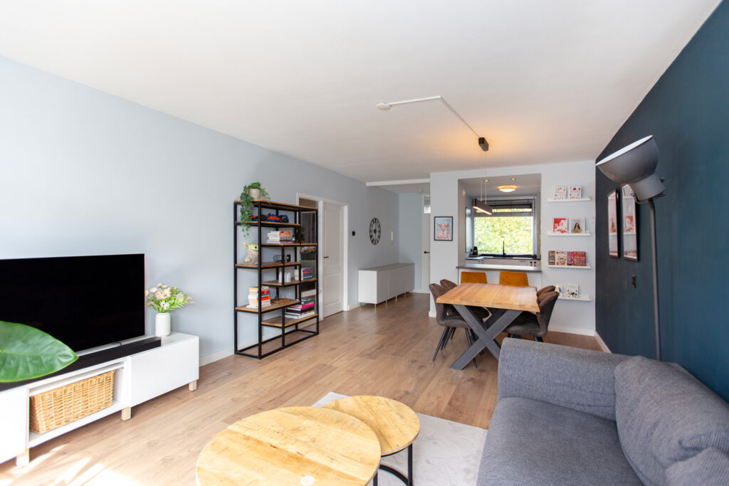 De woonkamer is ruim en biedt voldoende mogelijkheid tot het creëren van een comfortabele zithoek en eethoek. Dankzij de grote raampartijen is er in de gehele woonkamer sprake van veel natuurlijk licht en een prachtig groen uitzicht aan de achterzijde. De woonkamer geeft toegang tot het balkon, de keuken en de tussenhal die weer leidt naar de slaapkamers, badkamer en separate toiletruimte. In de woonkamer ligt een mooie, vanuit de hal doorgetrokken, laminaatvloer in de kleur eiken en alle wanden in het appartement zijn glad gestuukt.