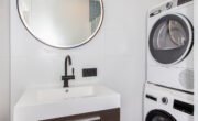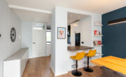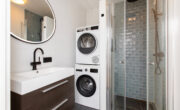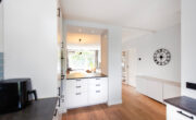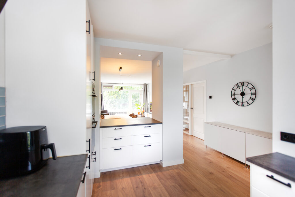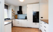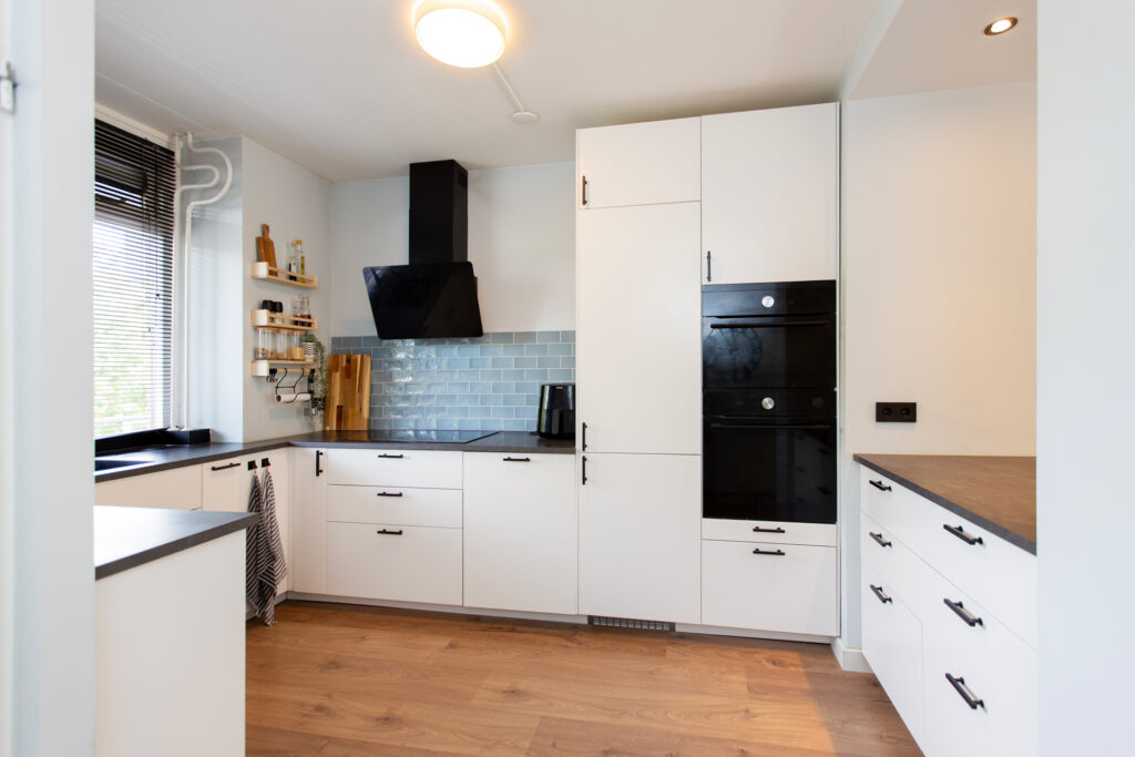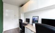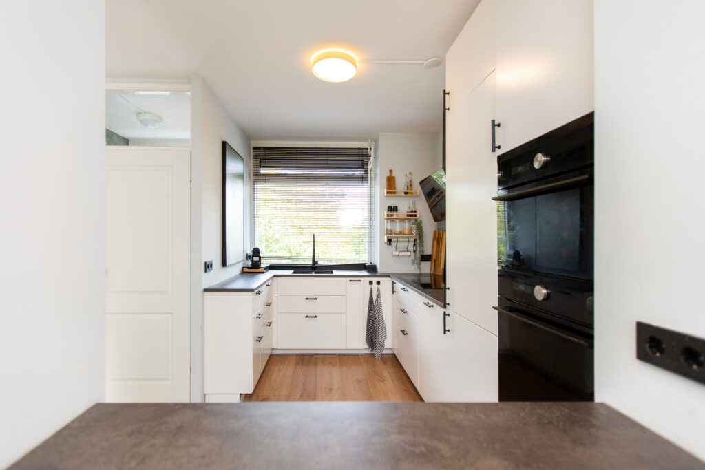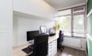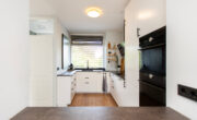 De open keuken bevindt zich aan de voorzijde van het appartement en wordt van de woonkamer gescheiden middels een praktisch eiland/ontbijtbar. De keuken is netjes en helemaal van nu dankzij de witte keuken kastjes i.c.m. een antraciet aanrechtblad. Naast veel opbergruimte tref je hier verder een 5 pits inductie met recirculatie, een combi oven, een stoom oven, een koel/vriescombinatie, een wastafel met zwarte mengkraan en een vaatwasser. De grote raampartij zorgt voor veel natuurlijke verlichting.