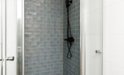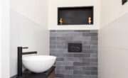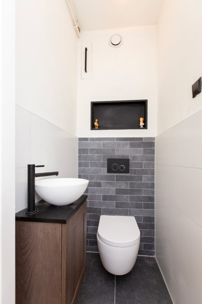 De separate toiletruimte ligt er direct naast en is deels betegeld in dezelfde moderne kleurstelling. Daarbij beschikt de toiletruimte tevens over een fonteintje.