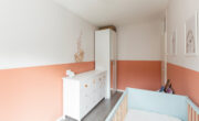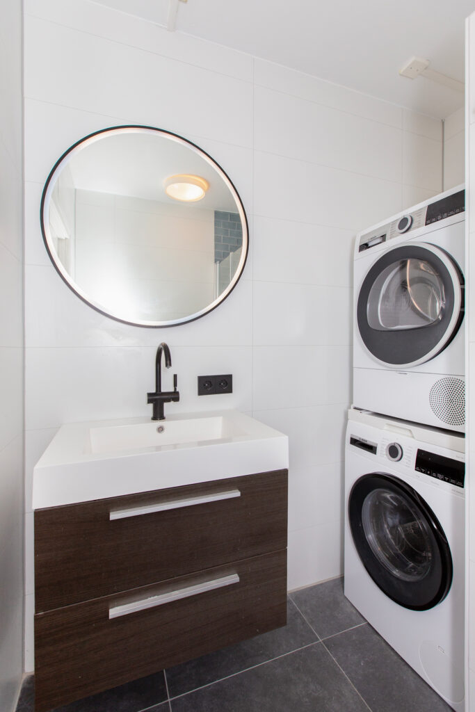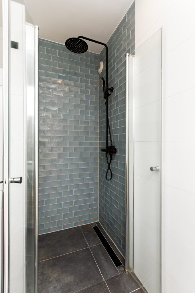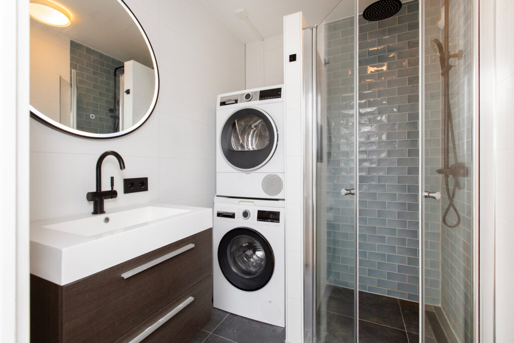 De moderne nette badkamer is vanuit de tussenhal toegankelijk, biedt veel ruimte en is voorzien van een douchehoek, een wastafel met meubel en grote spiegel, natuurlijke ventilatie en de aansluiting voor de wasmachine.