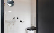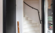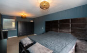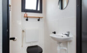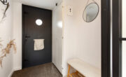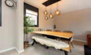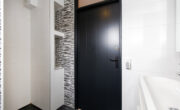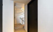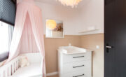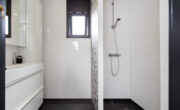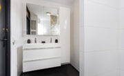 Via de lange overloop bereik je de badkamer, de toiletruimte, de trap naar de 2e verdieping, een diepe bergkast en 2 slaapkamers. De ouderslaapkamer is gigantisch en beschikt over een groot raam, type frans balkon, aan de voorzijde. De kinderkamer ligt aan de achterzijde. Door een andere indeling kan hier een extra kamer worden gecreëerd. De badkamer oogt modern met de zwart mêleerde stenen vloer i.c.m. strakke witte wandtegels en speelse grijs/witte mozaïek tegels. Verder tref je hier een ruime drempelloze inloopdouche, een brede wastafel met dubbele kraan en veel opbergruimte. De 2e toiletruimte is separaat en voorzien van witte wand en vloertegels met zwarte accessoires. De gehele verdieping is voorzien van een nette lichte pvc vloer.