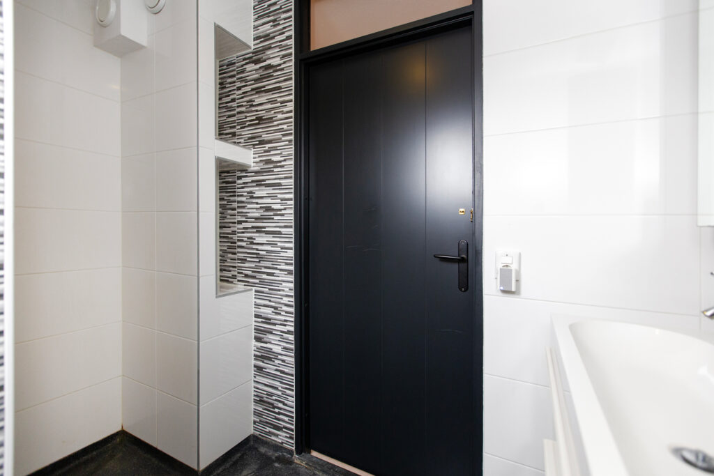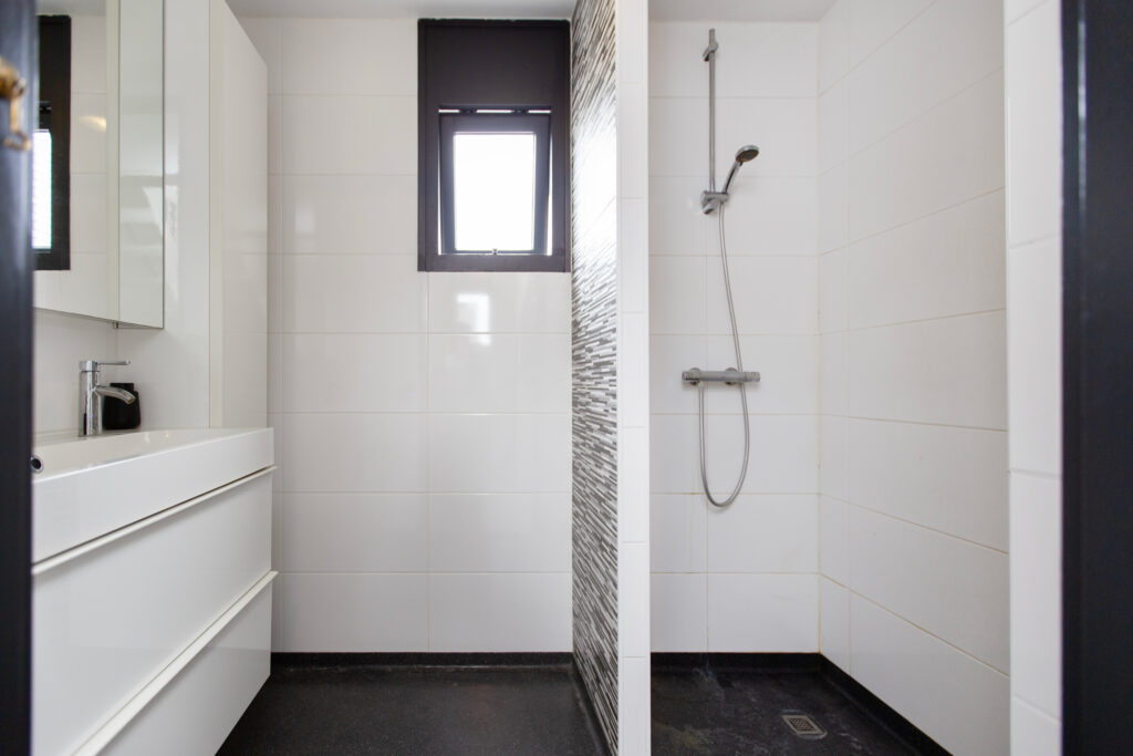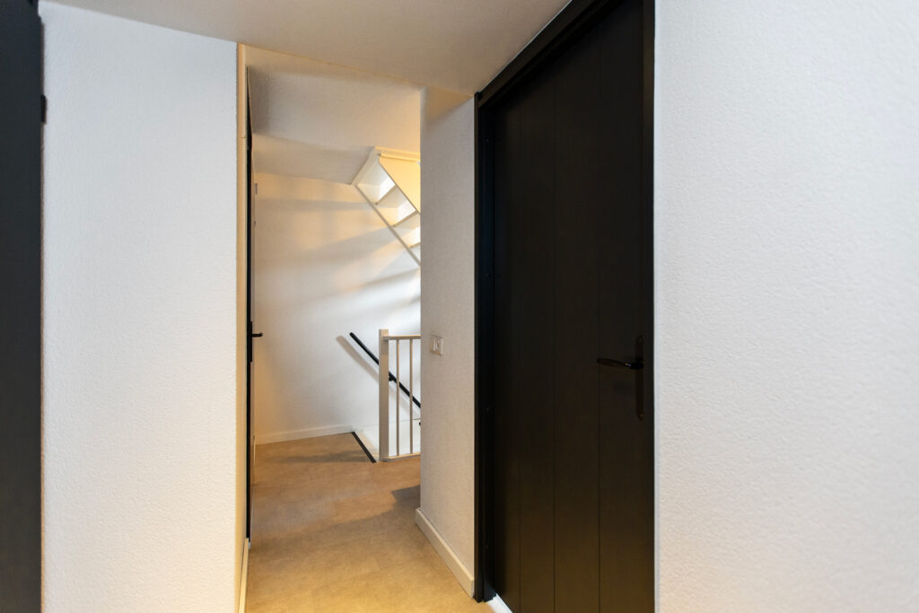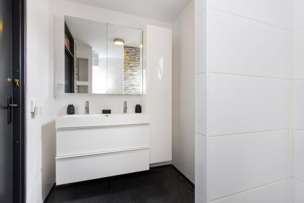 Via de lange overloop bereik je de badkamer, de toiletruimte, de trap naar de 2e verdieping, een diepe bergkast en 2 slaapkamers. De ouderslaapkamer is gigantisch en beschikt over een groot raam, type frans balkon, aan de voorzijde. De kinderkamer ligt aan de achterzijde. Door een andere indeling kan hier een extra kamer worden gecreëerd. De badkamer oogt modern met de zwart mêleerde stenen vloer i.c.m. strakke witte wandtegels en speelse grijs/witte mozaïek tegels. Verder tref je hier een ruime drempelloze inloopdouche, een brede wastafel met dubbele kraan en veel opbergruimte. De 2e toiletruimte is separaat en voorzien van witte wand en vloertegels met zwarte accessoires. De gehele verdieping is voorzien van een nette lichte pvc vloer.