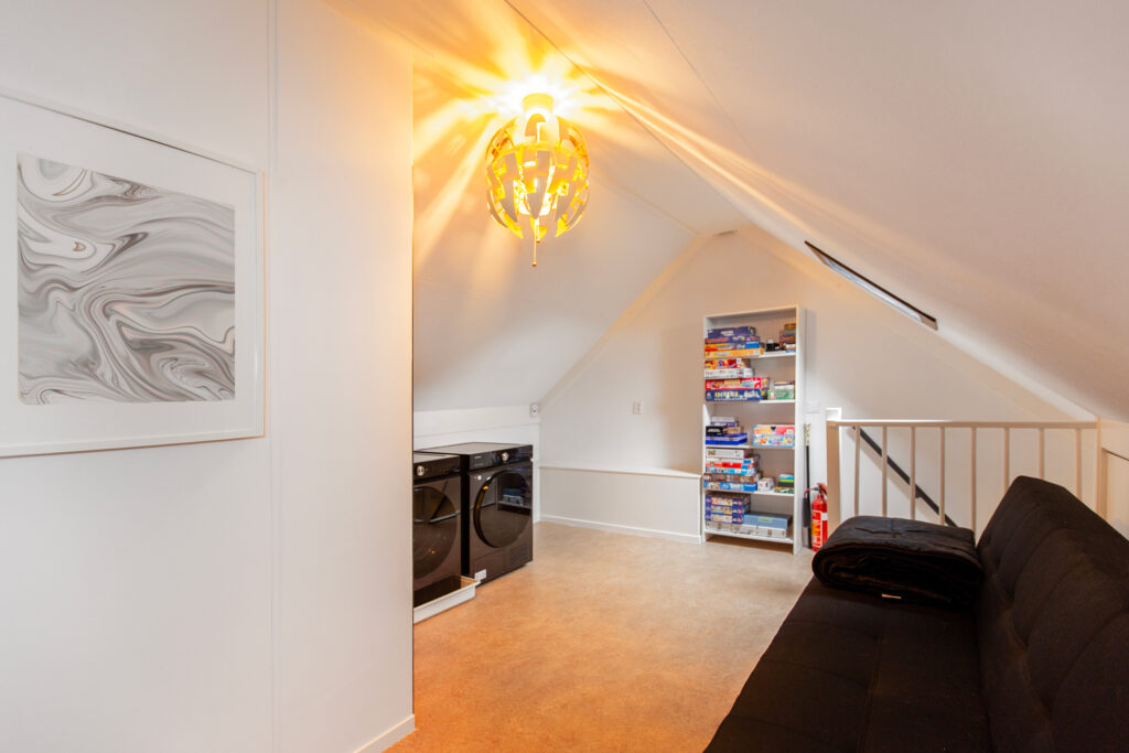 Zeer ruime overloop met aansluiting voor wasmachine, droger en veel opbergruimte onder de knieschotten. Toegang tot diepe kast met bergruimte, CV installatie, warmtewisselaar en toegang tot een ruime 3e slaapkamer. Met een andere indeling zou een extra kamer kunnen worden gecreëerd.