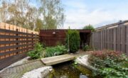 De woonkamer is tuingericht en biedt voldoende ruimte voor het realiseren van een mooie zithoek. Een uitbouw behoort tot de mogelijkheden. De keuken bevindt zich aan de voorzijde van de woning en kijkt uit op het Europapark. De L vormige keuken in de kleur licht bruin beschikt over een vaatwasser, gasfornuis, koel/vries meubel en combi oven. Op de gehele verdieping ligt een doorgetrokken witte plavuizen vloer met vloerverwarming in de woonkamer. De tuin bereikt u via een openslaande tuindeur. U zit hier heerlijk privé doordat de woning geen achterburen heeft. De tuin is voorzien van 2 terrassen met borders die met elkaar verbonden zijn middels een bruggetje over een vijver. Doordat de tuin gelegen is op het zuid-westen kunt u hier praktisch de hele dag van de zon genieten. Een houten berging met elektra biedt voldoende ruimte voor het stallen van tuinartikelen/fietsen. De tuin is ook in het bezit van een achterom.