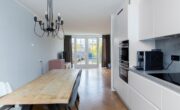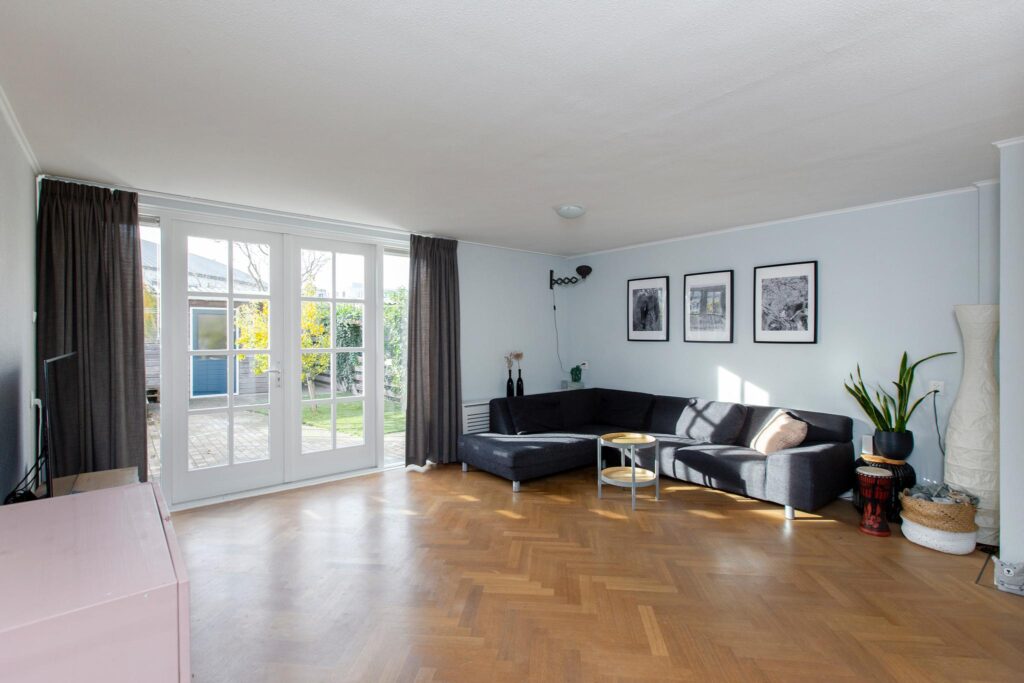 – Lichte tuingerichte woonkamer dankzij grote glazen pui met openslaande deuren