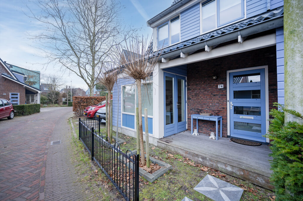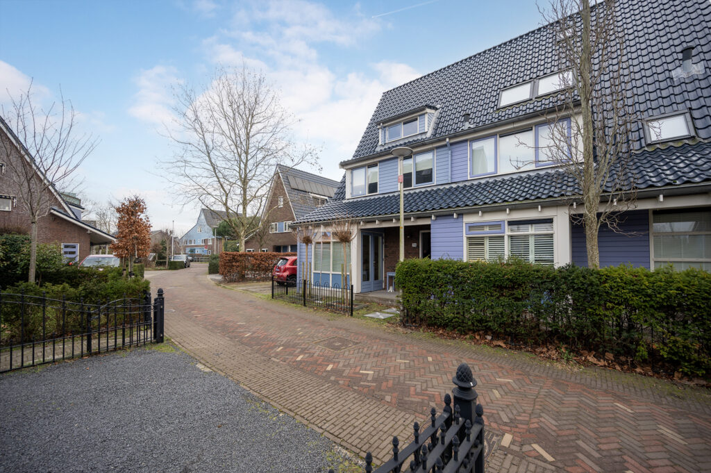 Brede bestrate oprit met plaats voor 2 auto’s met achter de parkeerplaatsen een afsluitbare toegangspoort naar tuin en garage. De voortuin is aangelegd met stapstenen, vaste boompjes en een ijzeren sierhekje. De woning is aan de voorzijde via de sfeervolle houten veranda te bereiken.