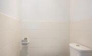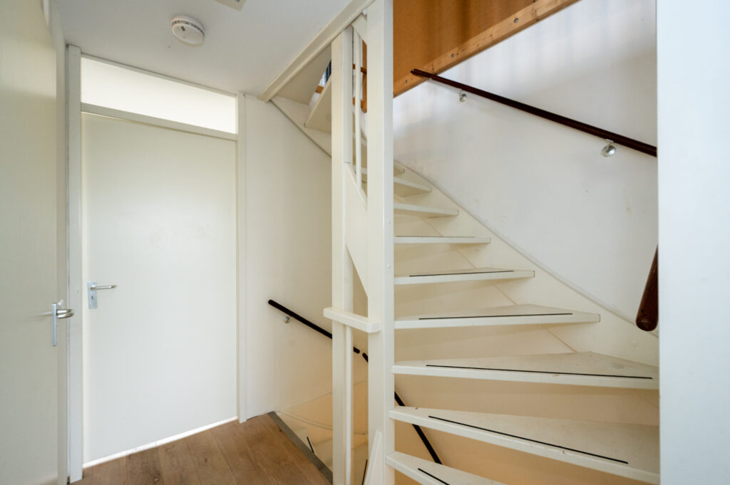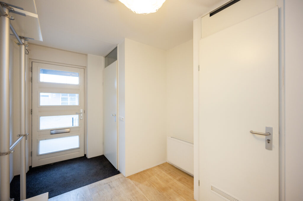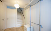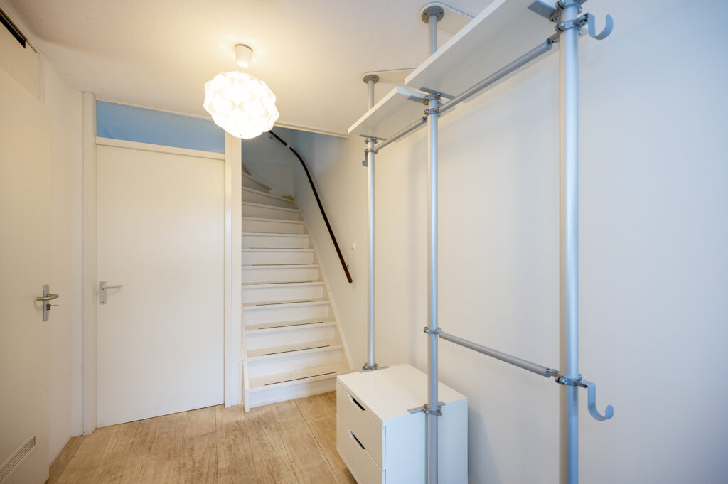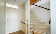 Ruime lichte hal met toegang tot de meterkast, garderobe opstelling, een vaste trap naar de 1e verdieping, toegangsdeur naar de woonkamer en de toilet ruimte. De toiletruimte is netjes en voorzien van een toilet, antraciet vloertegels i.c.m. witte wandtegels.
