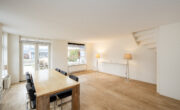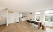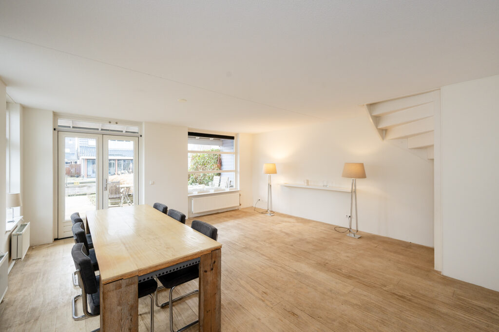 De woonkamer is licht en heeft een praktische indeling met een zit- en een eetgedeelte. De algehele afwerking is netjes met gestuukte wandafwerking en een doorgelegde natuur hardhouten vloer (Sequoia).