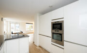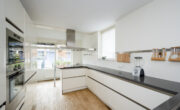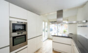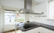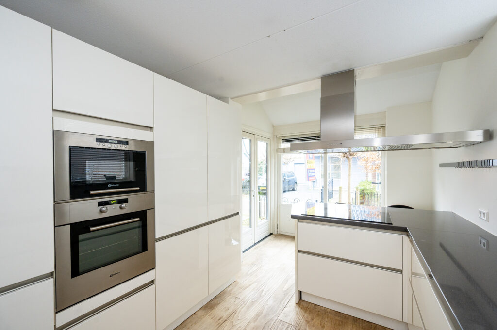 De open keuken is in parallelle opstelling geplaatst met een gezellig eetbarretje aan de voorzijde dat uitzicht biedt over de straat. Het aanrechtblad is een grijskleurige composiet natuurstenen aanrechtblad en is ruim van formaat. De keuken biedt veel opbergruimte dankzij de vele kastjes en laden. De volgende (inbouw)apparatuur is aanwezig en is deels vernieuwd; een inductiekookplaat, een RVS-recirculatie afzuigkap, een magnetron, een heteluchtoven, een vaatwasser en een koelkast met vriesvak en vriezer.