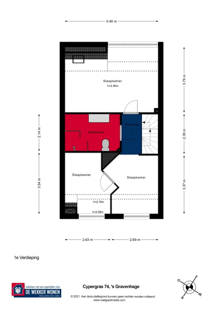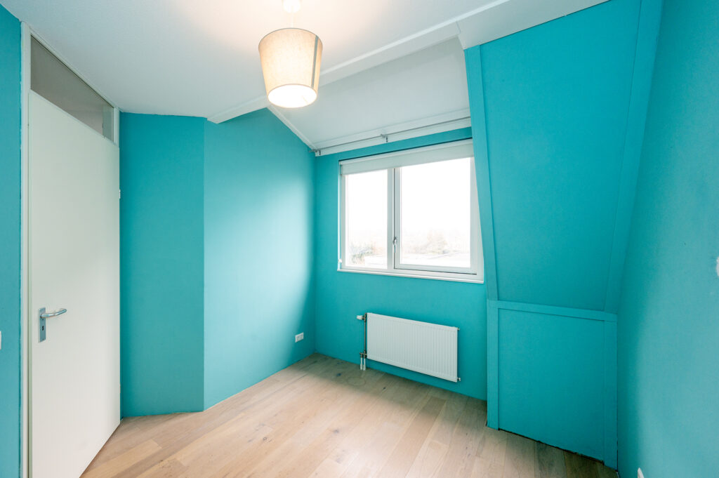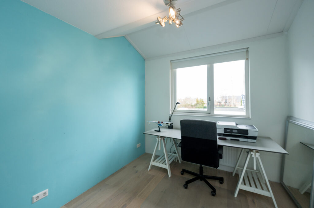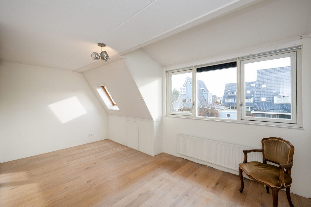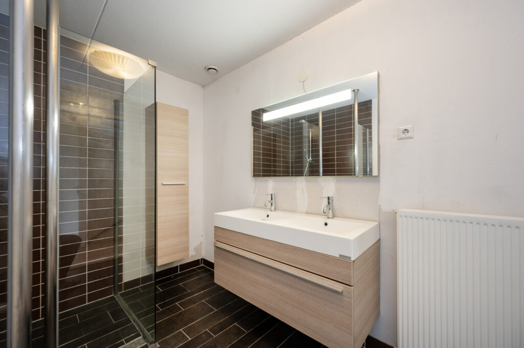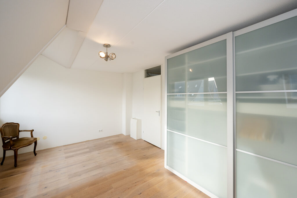 Ruime lichte overloop met vaste open trap en toegang tot twee slaapkamers met mogelijkheid tot 3 (!). De algehele afwerking op deze verdieping is netjes met gestuukte wandafwerking i.c.m. een doorgelegd lichtkleurige fineerpakket. De ouderslaapkamer is gevel breed en beschikt over een dakkapel en dakraam. Deze slaapkamer ligt aan de achterzijde van de woning en beschikt over een kledingkast. De tweede slaapkamer ligt aan de voorzijde en heeft eveneens een dakkapel. De badkamer is deels betegeld en voorzien van een douche met drain en glaswand, de 2e hangend toilet, een badkamermeubel met dubbele wastafel en bijpassende spiegel, een hangkast en een radiator. Omdat de overloop ruim van formaat is, mede door de geplaatste dakkapel, is er voldoende daglicht en ruimte om bijvoorbeeld een extra hobby-, werk-, of slaapkamer te realiseren.
