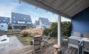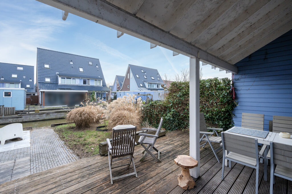 Via de openslaande hardhouden terrasdeuren bereikt je de buitenruimte onder de houten veranda.