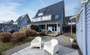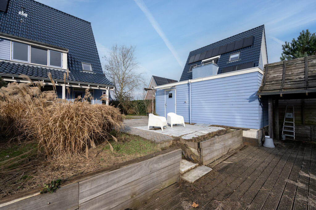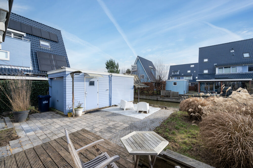 De woning beschikt over een voor-, zij- en achtertuin. De achtertuin is afsluitbaar middels een poort. De achtertuin is ruim, zonnig, ligt op het zuid oosten en beschikt over diverse terrassen i.c.m. beplanting en gazon waardoor er altijd ruimte is voor spelen, ontspanning of gezellig samenzijn. Achterin de tuin ligt op een lager gelegen gedeelte een houten vlonder die grenst aan het water. Op de vlonder achter de garage is een houten tuinoverkapping met een gezellig zitje en fraai uitzicht over het water. Deze dient wel te worden opgeknapt.
