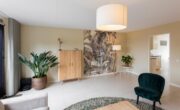 De living is ruim en heerlijk licht dankzij de grote glazen pui aan de achterzijde. Vanuit hier heeft u goed zicht op de achtertuin. Door het formaat van deze ruimte kunt u hier een royale zithoek creëren. Op de vloer ligt een over de gehele verdieping doorgetrokken champagne kleurige stenen vloer met vloerverwarming. Alle wanden zijn strak en netjes. Vanuit de living heeft u toegang tot de praktijk en tot de achtertuin.