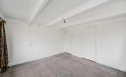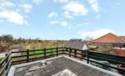 Deze bevinden zich aan de achterzijde van de woning. Een van deze kamers beschikt over dubbele openslaande deuren naar een groot dakterras met houten balustrade en vrij zicht op groen.