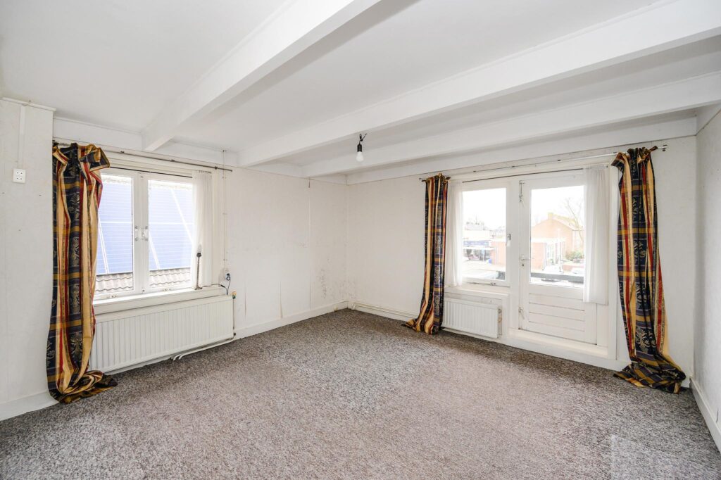 De royale woonkamer bevindt zich aan de voorzijde van de woning en betreft een samenvoeging van 2 voormalige kamers. Hierdoor is een hele mooie lichte ruimte gecreëerd. De inbouwkasten, de nis voor de kachel, de fraaie sierlijsten op het plafond en de grote raampartijen geven cachet aan de ruimte. Verder zijn de wanden gestuukt en is de vloer voorzien van laminaat. Via de woonkamer bereikt u de erker.